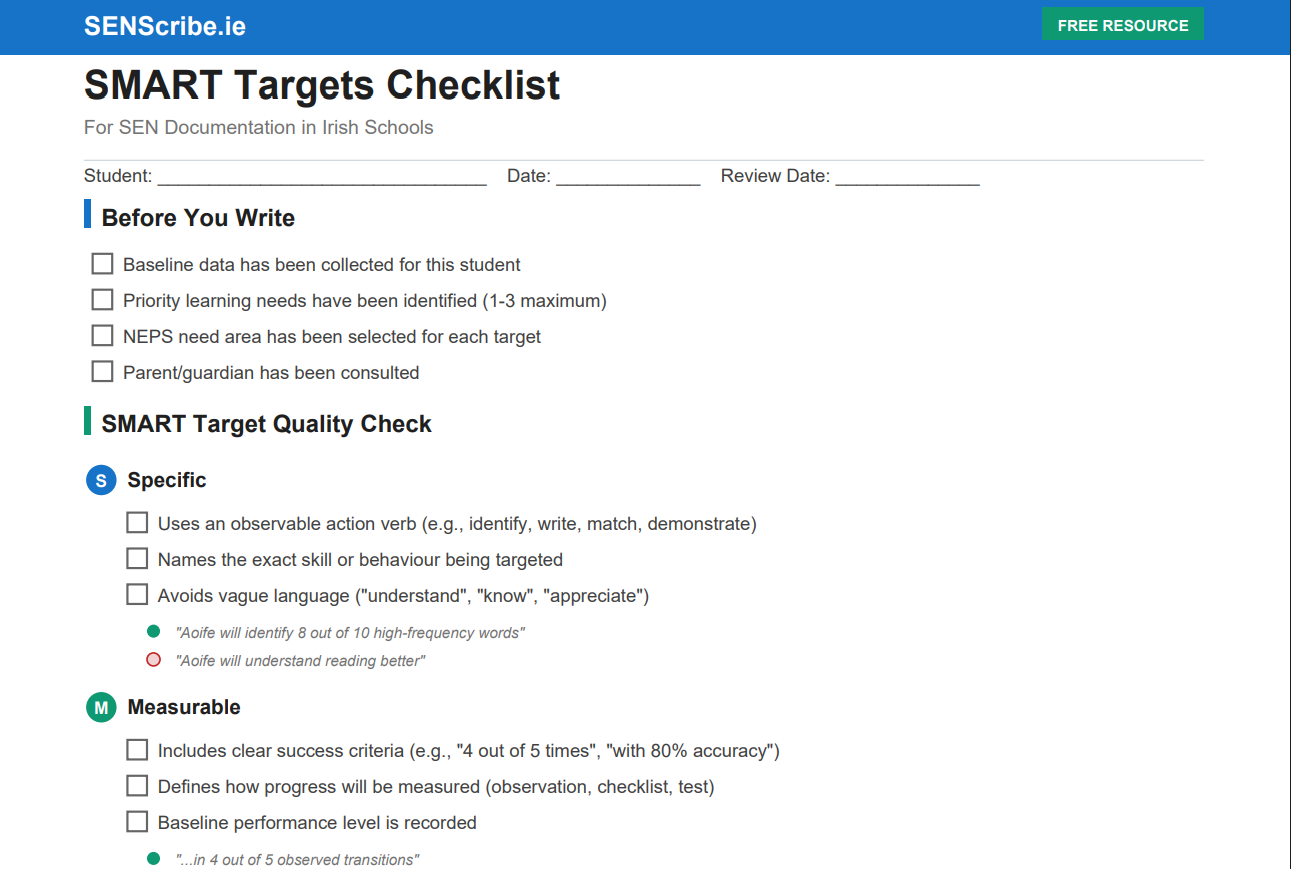 Yes, this checklist is completely free to download, print, and use in your school. It is provided by SENScribe to support Irish teachers with quality SMART target writing for SEN documentation.